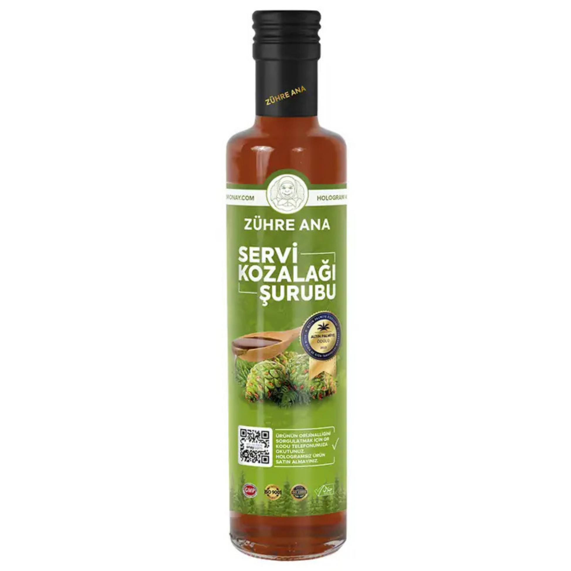 Zühre Ana Servi Kozalağı Şurubu, doğal içeriklerin bir araya getirildiği güçlü ve zengin içerikli bir takviye edici gıdadır. Servi kozalağı ekstresi, kara mürver ekstresi, zencefil, tarçın, damla sakızı ve çeşitli bitki özleriyle hazırlanmıştır. 500 ml.